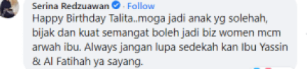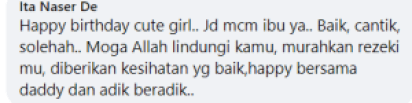 Dalam pada itu, ramai yang memberi ucapan hari lahir serta mendoakan Dzahira Talita supaya menjadi anak yang baik dan berjaya dalam hidupnya.