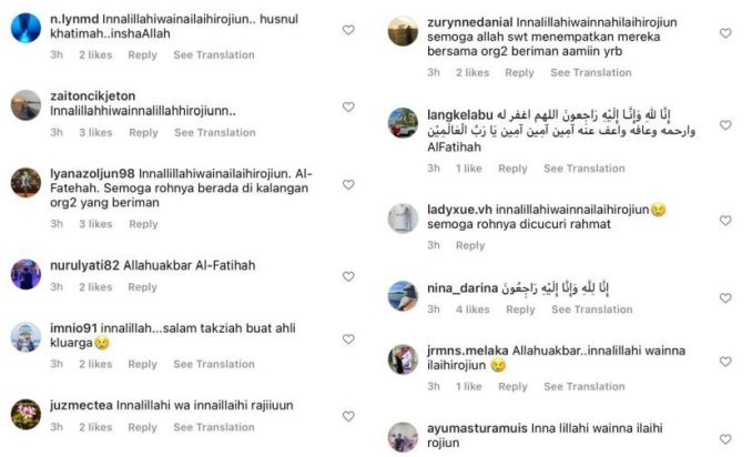 Semakan mStar menerusi ruangan komen mendapati posting berkenaan dihujani dengan ucapan takziah daripada netizen.