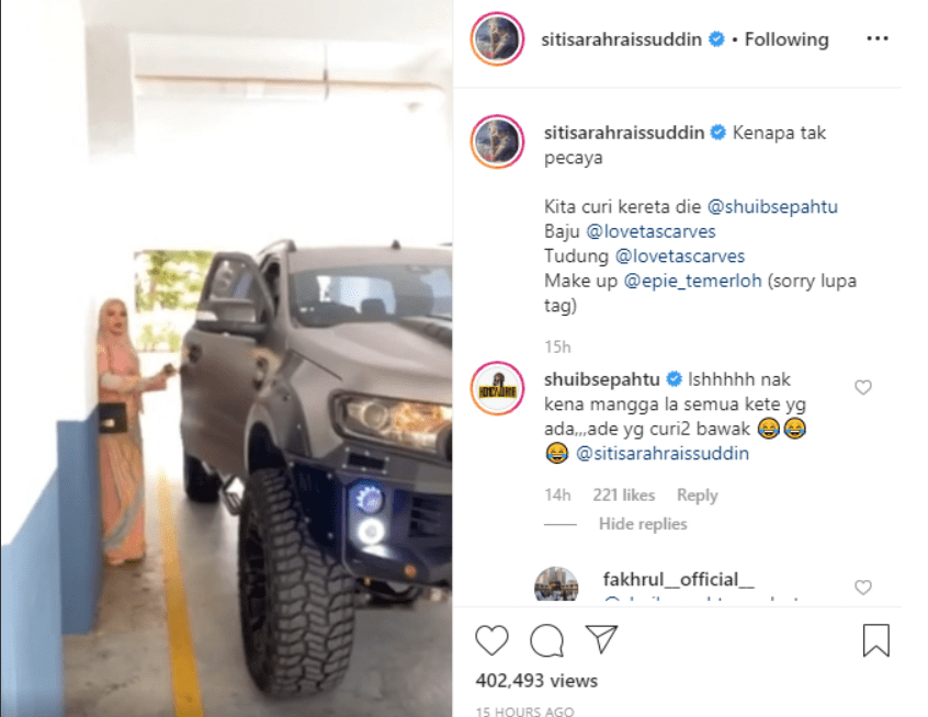 Terbaru Sarah telah memuatnaik satu video dimana beliau telah ‘mencvri’ kereta suaminya dan telah memandu ke tempat kerja. Siapa sangka kereta yang dipandu beliau merupakan sebuah kereta pancuan 4X4. Video yang dikongsi mendapat pelbagai komen dan juga respon dari semua pihak termasuklah suami beliau sendiri.